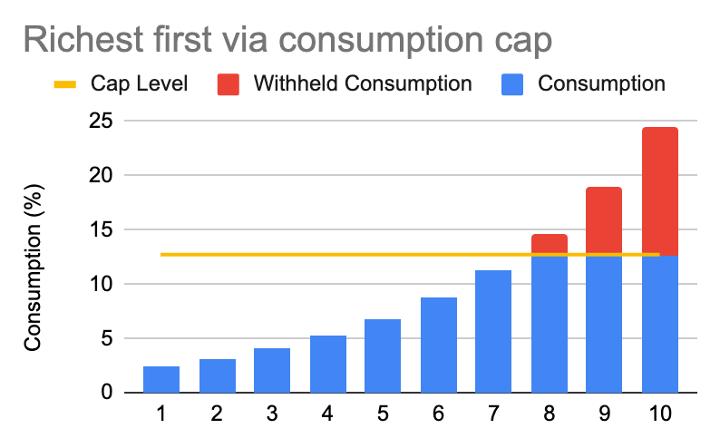 On the other end of the spectrum, one can make the numbers work by drawing a horizontal maximum consumption line to which all consumption is reduced, such that the amount reduced totals 20%. This is effectively a richest-first reduction, because this consumption cap clearly cannot affect anyone whose consumption is already below the line.