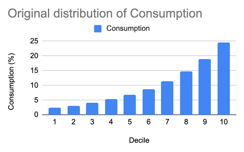 The graph above shows how personal consumption is distributed in this make-believe economy. In a perfectly even distribution of consumption, all of the bars would be the same height at 10%, so you can see here that this society, like most, has some significant consumption inequality: the bottom decile consumes about 2.5% of the total, and the top decile consumes about 25% of the total. You can see in the graph that the bottom 60% consumes less than average (10%), while the top 40% consumes more than average.