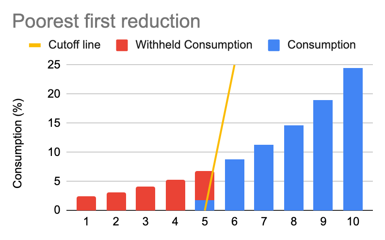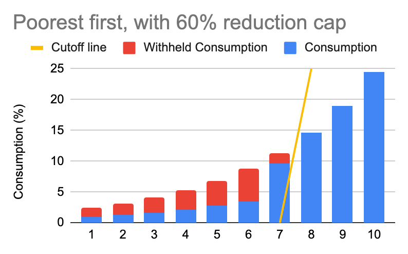 To understand what I mean, let us make this a little more realistic by capping the reduction to 60% of original consumption, but otherwise keeping the poorest-first reduction pattern in place. You can see this shown below on the right.