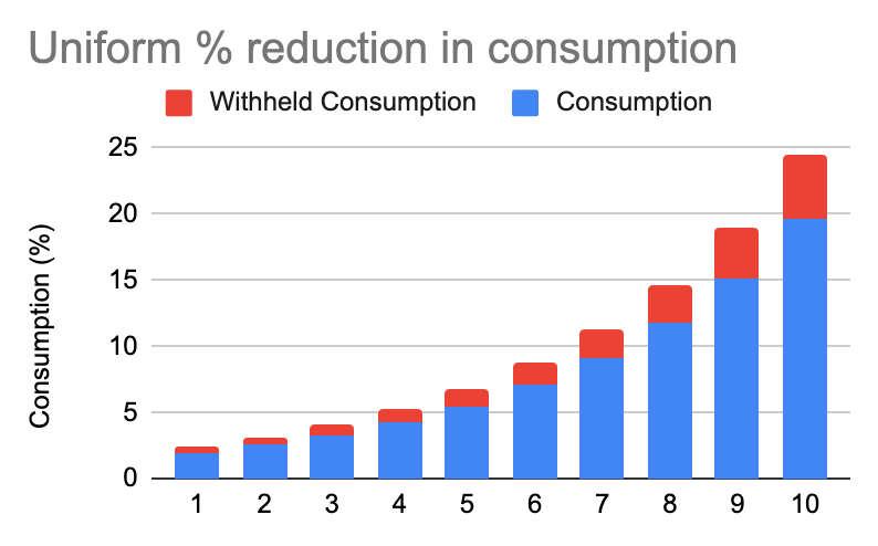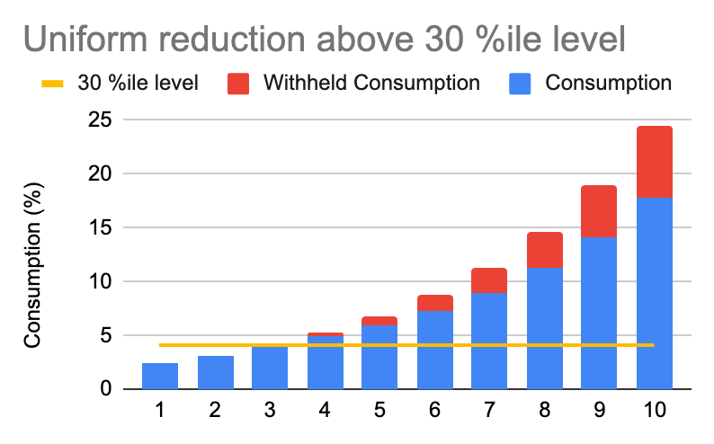 Avoiding either extreme, another approach would be to reduce everyone's consumption evenly. Below on the left, you can see the simplest version of this, where everyone's reduction is reduced by 20%, regardless of their starting point. On the right, you can see a modified version where a baseline amount of consumption is protected and consumption above that is reduced by a uniform percentage, about a third. The two are similar, with the one on the left exactly preserving the preexisting amount of consumption inequality and the one on the right very slightly reducing consumption inequality.